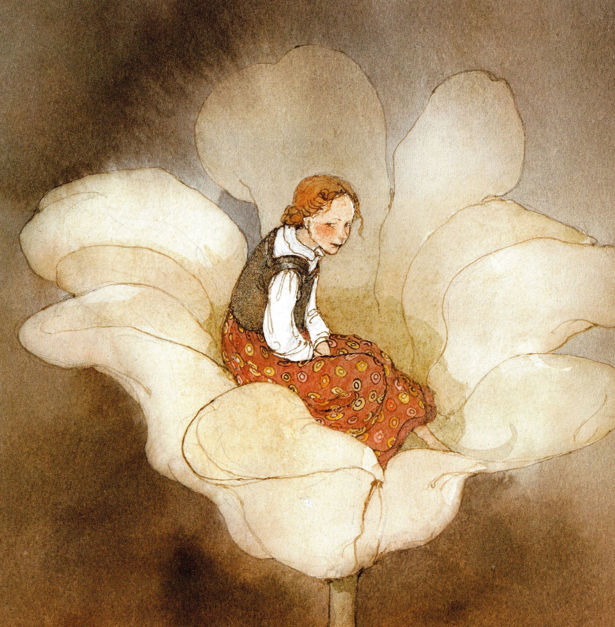 Midden in de bloem zat een klein mannetje, licht en doorzichtig als van glas; een gouden kroontje droeg hij op het hoofd en om zijn schouders lichte witte vleugels; hij was niet grooter dan Duimelijntje. Dat was de engel van de bloem.